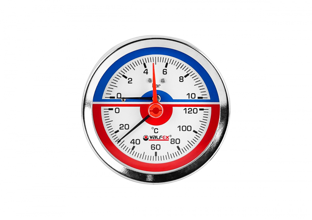 Термоманометр предназначен для одновременного измерения давления и температуры воды и других сред, неагрессивных к сплавам меди. Он представляет собой объединенные в одном корпусе деформационный манометр и биметаллический термометр. Для снятия показаний предусмотрены две шкалы – давления и температуры.