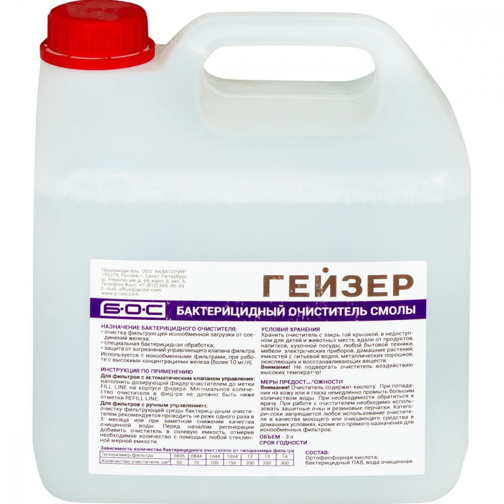Бактерицидный очиститель предназначен для устранения из ионообменной смолы частиц железа и других примесей. Добавляется в регенерирующий солевой раствор при помощи специального дозатора. Обладает отличными дезинфицирующими свойствами. Удаляет различные осадки из клапанов систем управления фильтром. Значительно продлевает срок службы наполнителя. Продается в экономичной 3 литровой канистре из пластика. Герметичная крышка позволяет избежать протекания продукта.